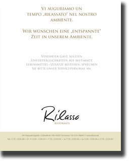 Für alle Freunde von gutem Essen bietet das Ristorante Rilasso frische Speisen und Wohlfühlatmosphäre. Genießen Sie Ihren Aufenthalt in unserem Restaurant in Aplerbeck und erleben Sie Kochkunst und edle Tischkultur.